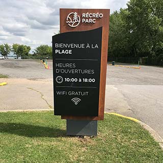 L’enseigne pylône sur poteau est une enseigne érigée sur une base de béton ou un pieux vissé. Elle est autoportante et permet de situer l’emplacement d’une entreprise ou un ensemble de commerces. Elle peut être rétro éclairée, non lumineuse ou composée d’un éclairage indirect.